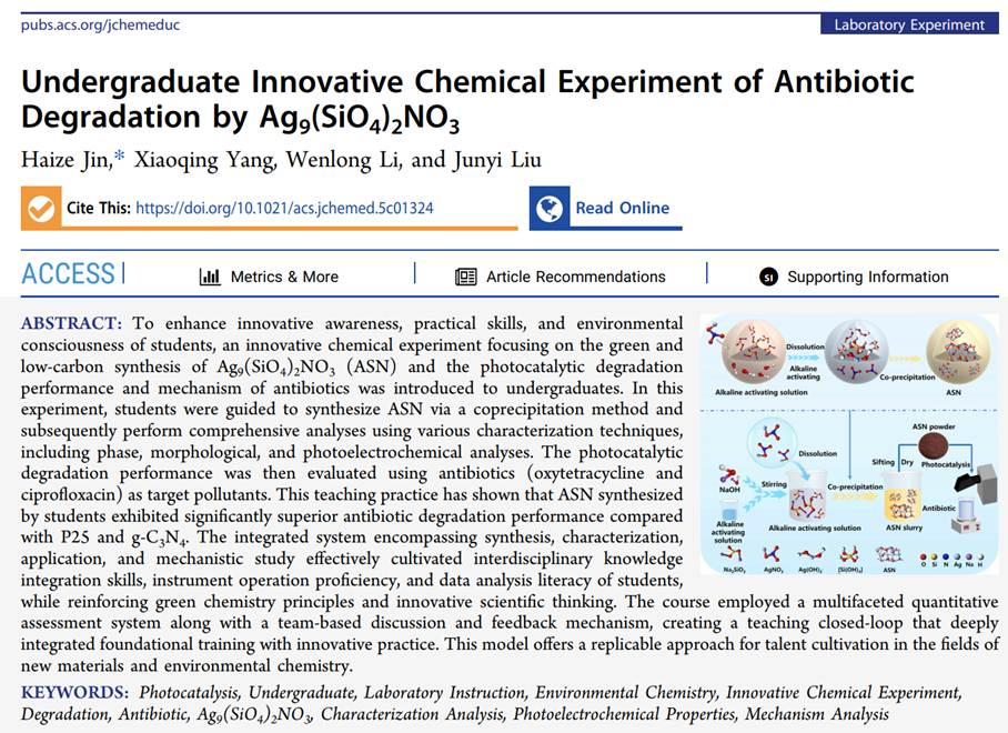 近日,材料科学与工程学院无机非金属材料工程专业的金海泽副教授团队在基础训练与创新实践深度融合方面取得了重大研究进展。针对本科生,团队提出了一项以绿色与低碳结合为核心的创新性化学实验。该实验涵盖了合成、表征、应用和机理研究等综合性、系统性的教学内容,同时采用了多方面的定量评估体系以及基于团队的讨论和反馈机制,形成了一个教学闭环。通过实践,有效培养了学生跨学科知识运用与整合能力、仪器操作熟练度以及数据分析素养。这种模式为新材料和环境化学领域的人才培养提供了一种可复制的途径。该成果已发表在美国化学会旗下的《Journal of Chemical Education》期刊(创刊于1924年,是全球化学教育领域首屈一指的旗舰SCI期刊,在国际化学教育界享有极高的权威性和广泛影响力),论文题为《Undergraduate Innovative Chemical Experiment of Antibiotic Degradation by Ag9(SiO4)2NO3》。金海泽副教授为该论文的第一作者和通讯作者,我校是该成果的唯一完成单位。