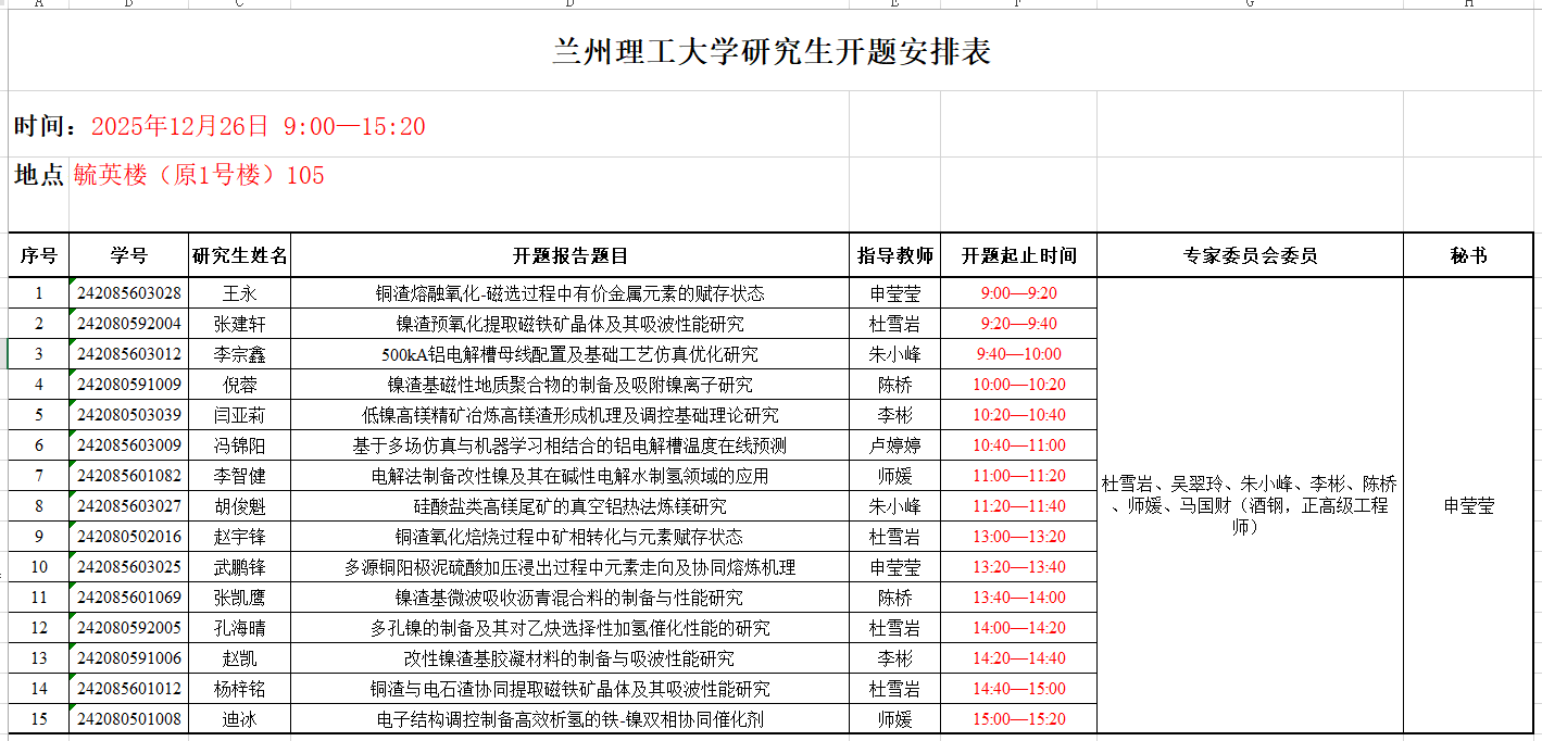 2025年硕士开题答辩会于2025年12月26日在毓英楼105举行。出席此次答辩会的评委老师有杜雪岩教授、吴翠玲副教授、朱小峰副教授、李彬副教授、陈桥副教授、师媛副研究员和马国财正高级工程师,申莹莹副教授担任本次答辩会的答辩秘书。