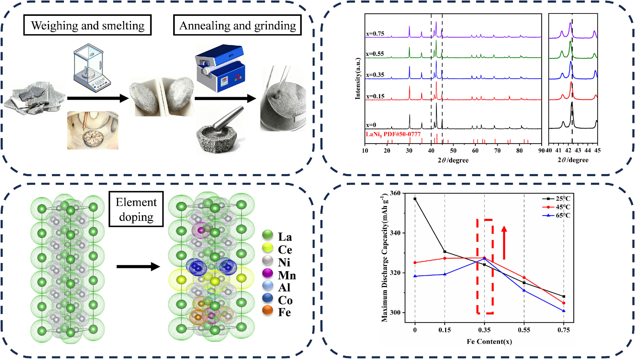 对退火态La0.80Ce0.20Ni3.63Mn0.35Al0.27Co0.75-xFex储氢合金研究表明:Fe掺杂未改变CaCu5型六方结构,仅使晶格膨胀,Fe优先占据3g晶位优化氢扩散路径,元素分布均匀。适量Fe(x=0.35)显著提升65℃电化学性能,降低腐蚀电流,抑制副反应;过量Fe则劣化容量与倍率。高温可改善高Fe样品动力学。Fe-Co协同掺杂实现宽温域性能与成本协同优化,为低成本高温镍氢负极提供可行方案。