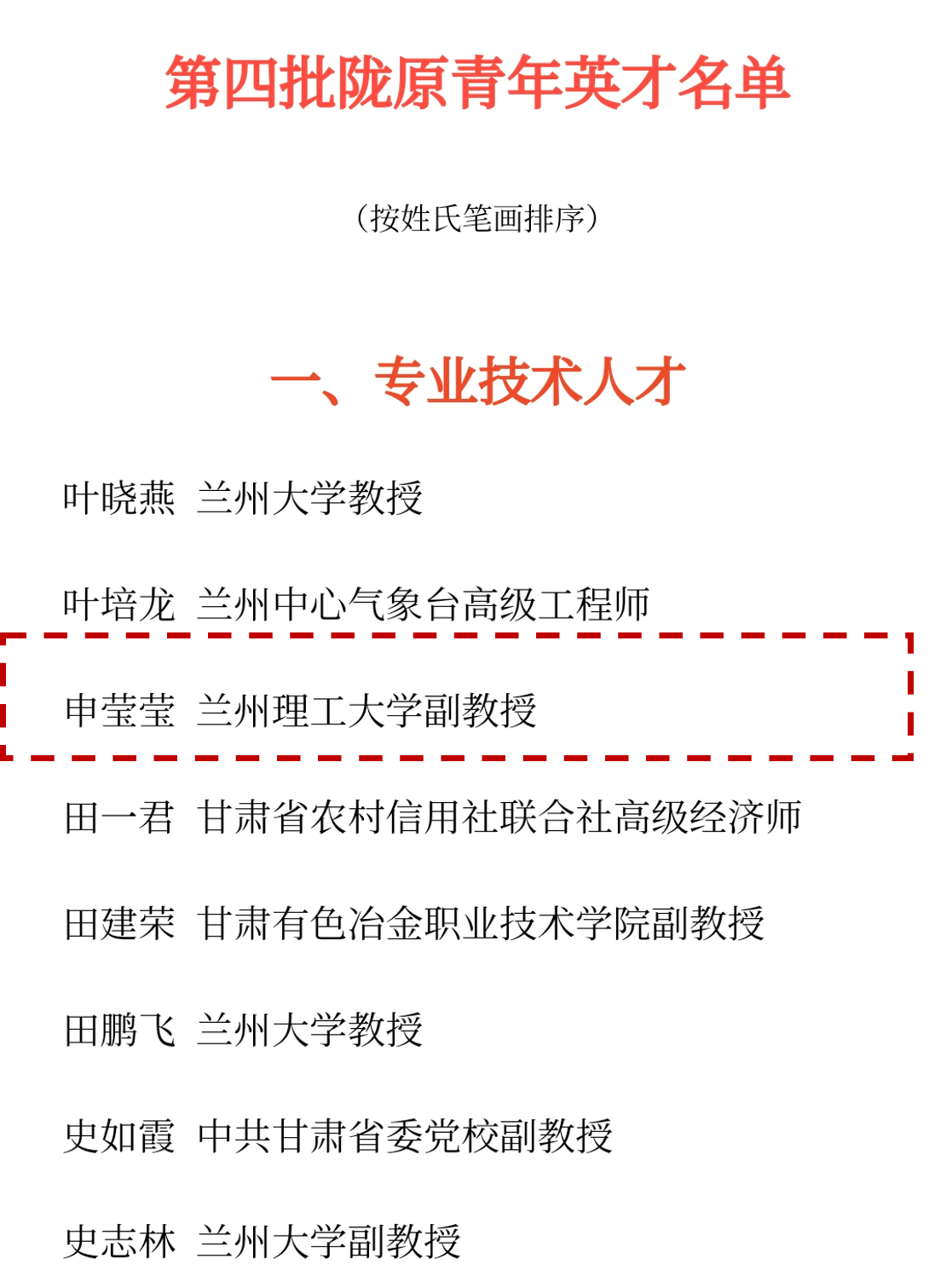 恭喜!课题组申莹莹老师荣获第四批陇原青年英才的专业技术人才称号