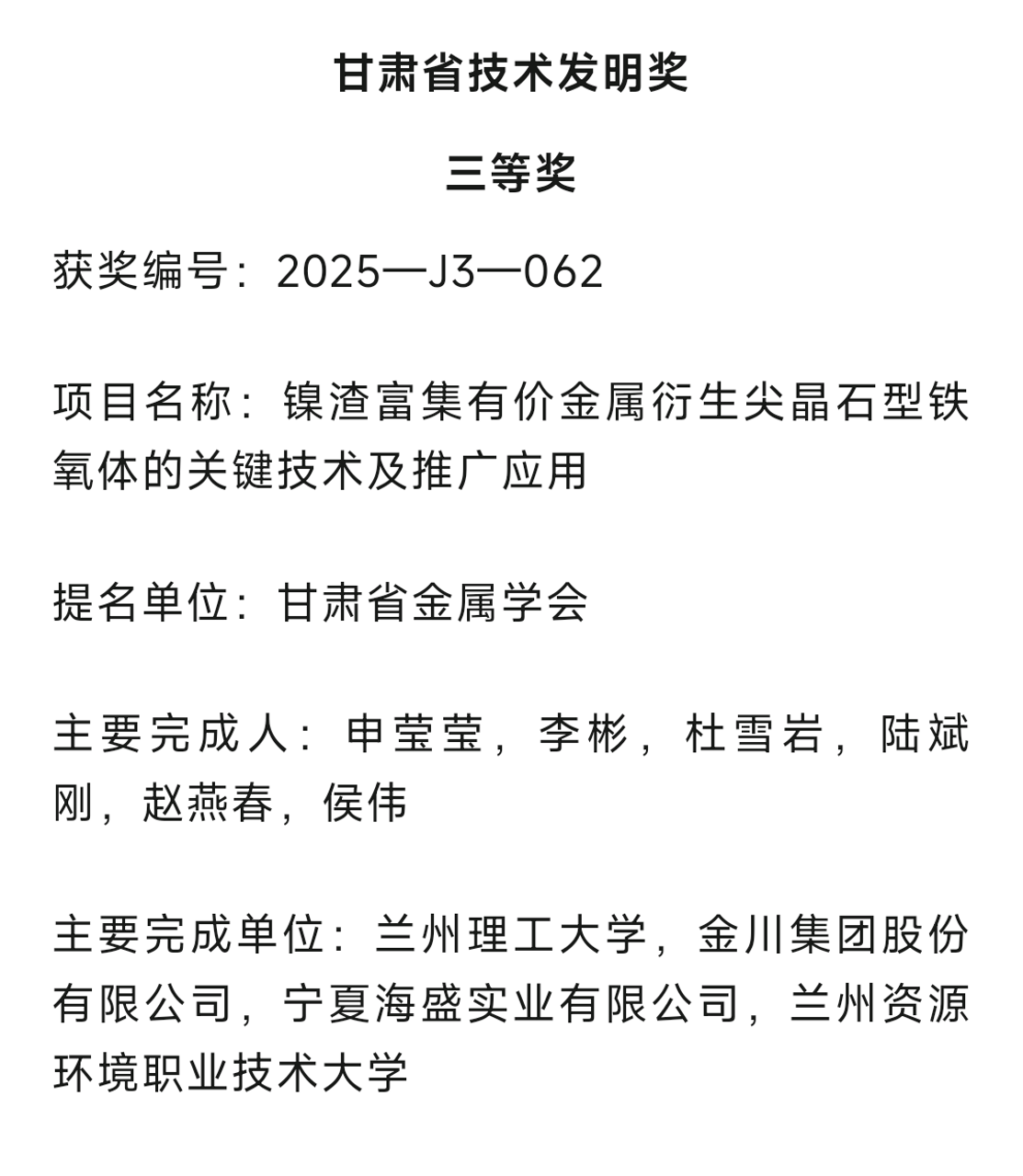 课题组申莹莹老师项目荣获甘肃省技术发明奖三等奖
